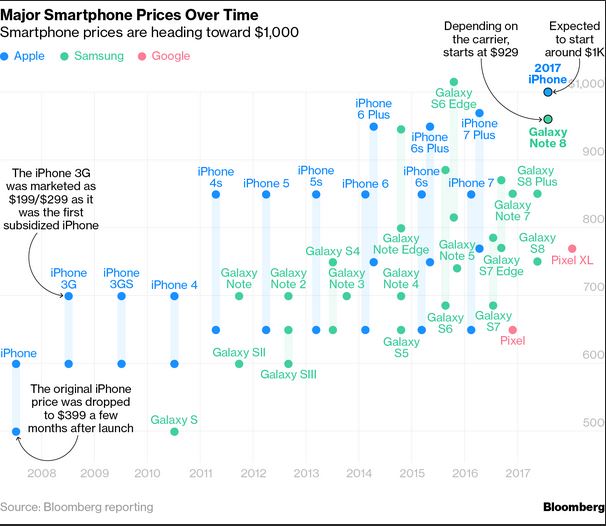 Específicamente, el iPhone X y el Galaxy Note 8 de Samsung son los más caros del mercado, pero Google no se queda atrás, pues antes solían entregar una de las mejores relaciones precio-calidad del mercado, pero ahora ofrecen un producto con un precio premium.