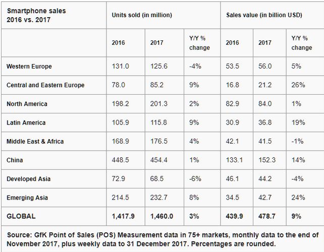 Según la firma GfK, el precio promedio de los smartphones en 2017 subió en un 10%, con una media de USD $363 por equipo, mientras que el número de smartphones vendidos a nivel mundial sumó un escueto 1% con respecto al año anterior.