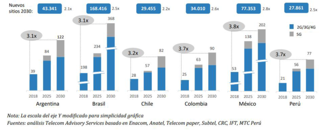 El estudio proyecta que, con la evolución de 4G y de 5G, más un nivel de compartición del 25%, se van a necesitar para 2030 entre 2 y 3 veces más de los sitios que existían para 2018.