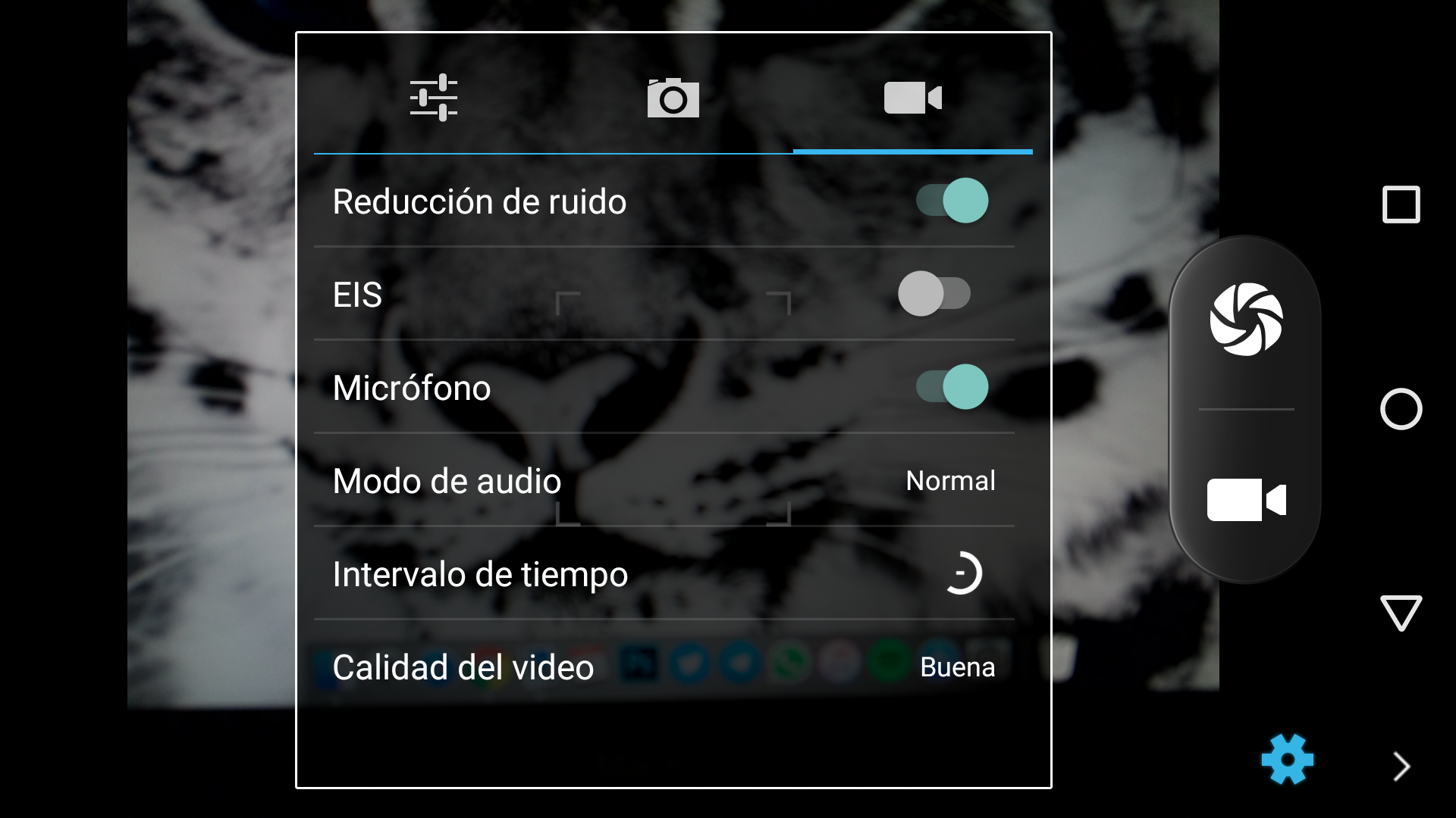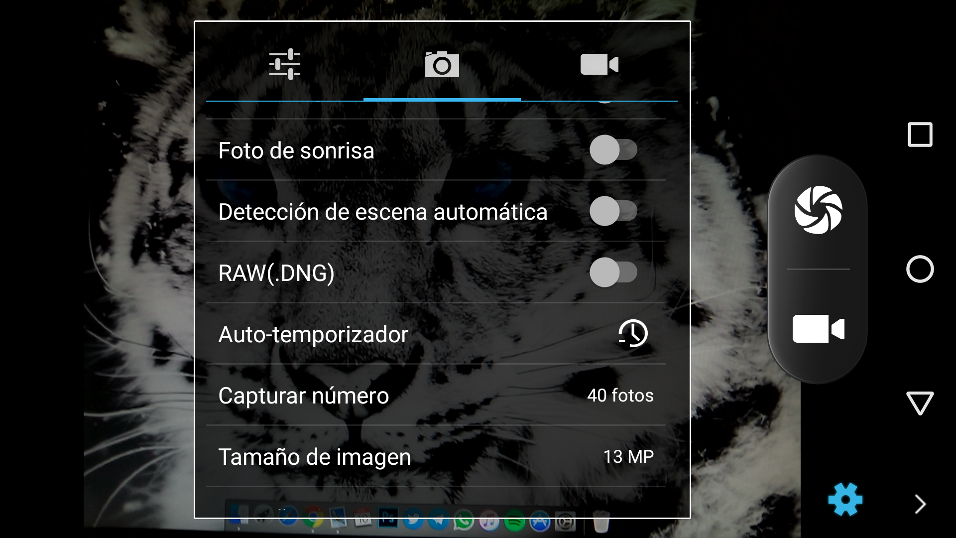 Luego encontramos el menú de ajustes donde podemos modificar la resolución, el valor de la exposición, balance de blancos, detección de rostro, sonrisa, activar el formato RAW, el ISO, el formato de imagen… entre otras funciones.
