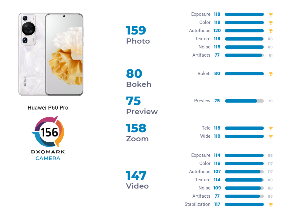 Pero volvamos al Huawei P60 Pro. En el apartado de fotografía como tal consiguió 159 puntos. En Bokeh 80 tantos, en Preview 75, en el Zoom 158 y en Video 147.