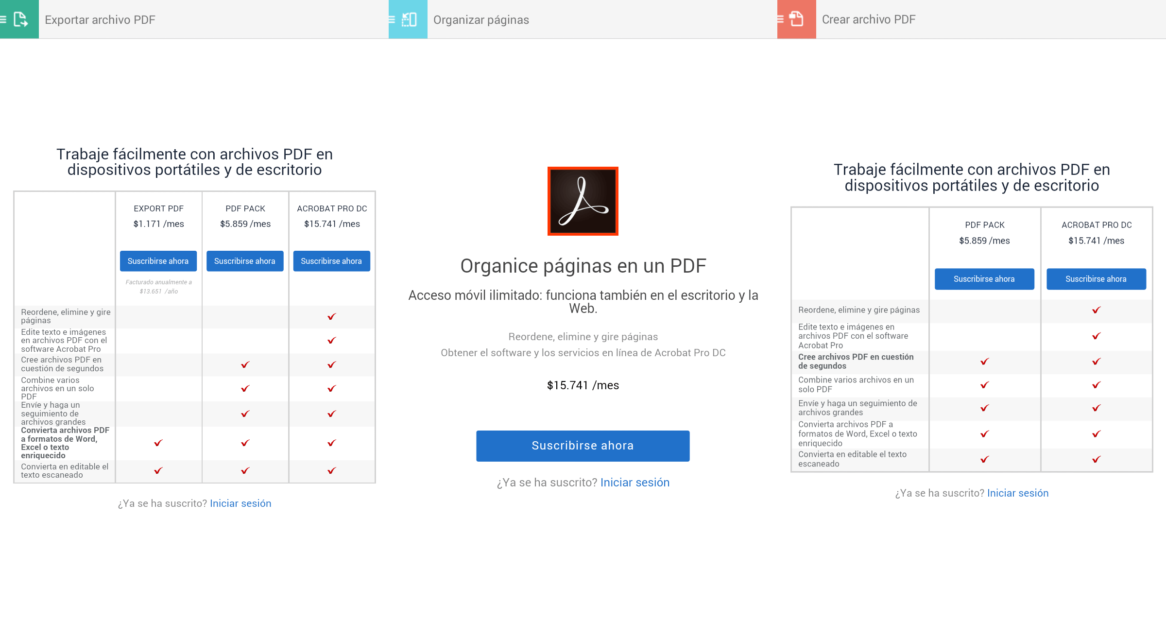 Ahora puedes crear un PDF a partir de otros documentos, pero esto te costará desde CLP $5.859 por mes, también podrás exportar tus PDF a otros formatos desde CLP $1.171 por mes y reordenar, eliminar o girar páginas de tu PDF tiene un valor de CLP $15.741 por mes (que es el costo por todas las funciones anteriores).