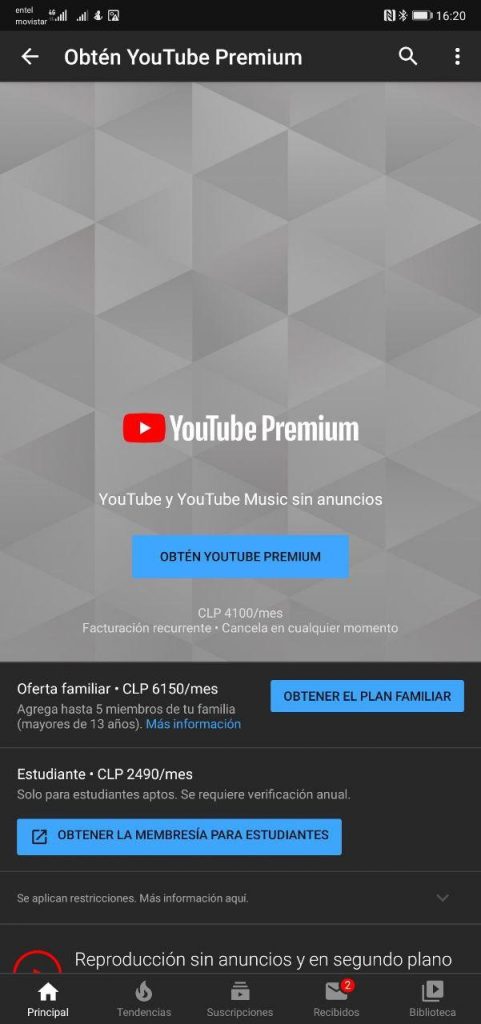 Se trata del servicio YouTube Premium, aquel que nos permite liberarnos de toda la publicidad molesta cuando visualizamos videos, así como también acceder a contenido exclusivo y al servicio de música YouTube Music.