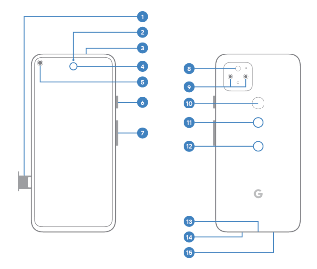 Como podrás apreciar en el ítem número 4, el auricular superior se señala en una ubicación un poco más debajo de lo tradicional, mientras que arriba está el ítem número 2 que señala el sensor de luz ambiente, aunque si vemos el protector de pantalla oficial en Google Store, aquel sensor estaría ligeramente más a la izquierda.