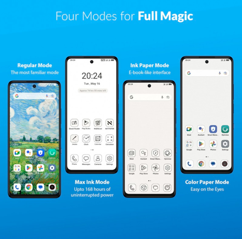 La opción Max Ink Mode transforma la interfaz del teléfono a escala de grises para una experiencia de lectura sin distracciones y prolonga la duración de la batería hasta 7 días de lectura. Luego está Ink Paper Mode para brindar una interfaz similar a la de un libro electrónico. Colour Paper Mode fue diseñado para novelas gráficas, cómics y periódicos electrónicos.