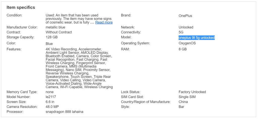 Algo curioso radica en que si bien en el título de la publicación se lo llama OnePlus 9, en la sección donde se desarrollan más los ítems y especificaciones el vendedor coloca OnePlus9t. Aquí te dejo con otra captura en donde resalté/remarqué ello: