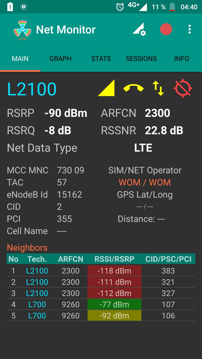 Ahí podemos ver que el cliente efectivamente está en la red AWS de WOM y conectado a las bandas LTE B4 (1700/2100 MHz) y B28 (700 MHz), de hecho se logra apreciar con detalle el icono «4G+».