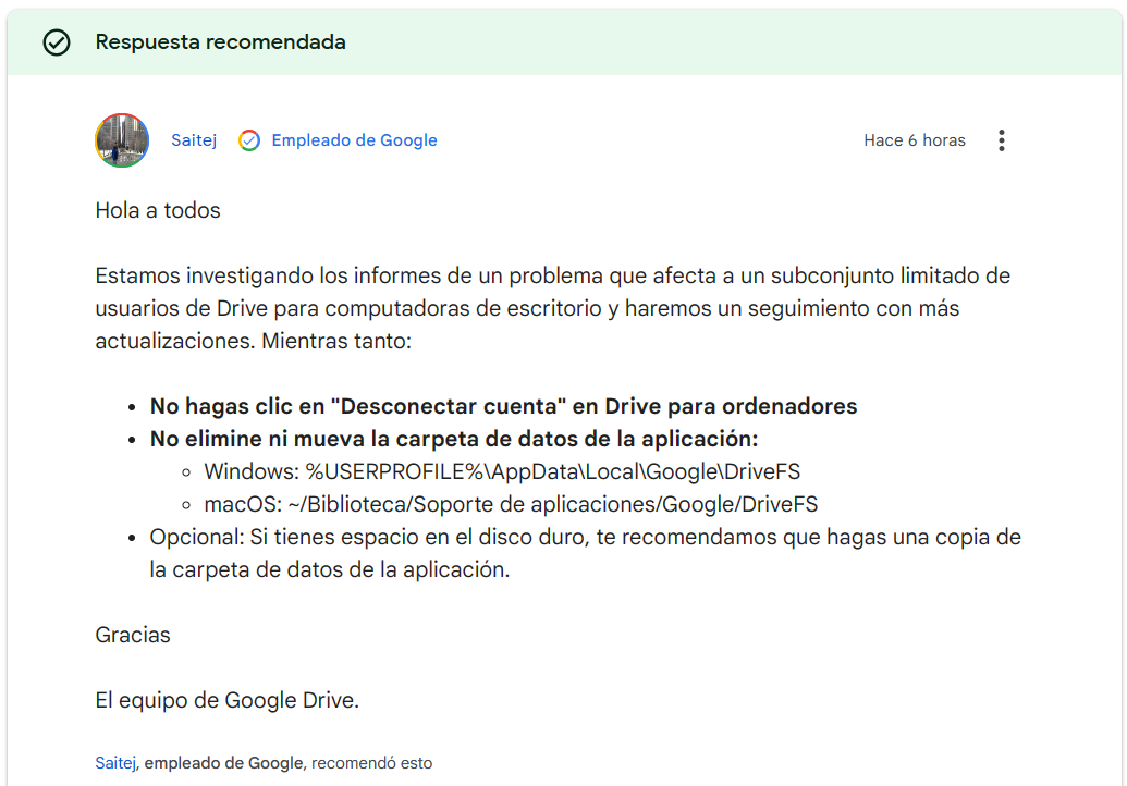 A través de la sección de ayuda de Google Drive, la compañía ha recomendado a los usuarios afectados que no realicen nuevos cambios en su cuenta, prácticamente recomiendan no hacer nada hasta que puedan identificar el problema.