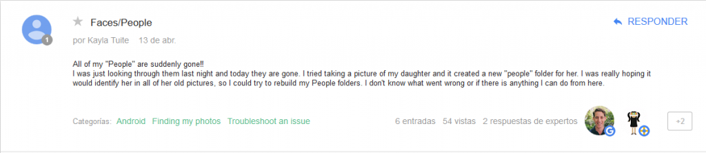 En la página oficial de Google, ciertos usuarios están reportando que las carpetas creadas con la función «personas» están desapareciendo, causando la preocupación de los mismos, pues fotos de seres queridos han desaparecido de un día para otro sin aviso.