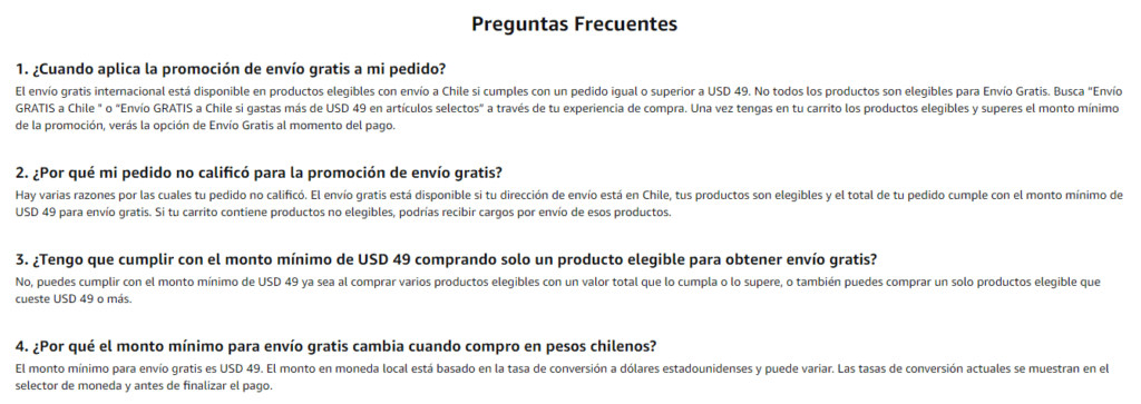 El beneficio consiste en envío gratis en millones de productos para compras para montos superiores a USD $49 (aproximadamente CLP $35.000) en un producto o varios. Según Amazon, cuando seleccionemos un producto, antes de pagar se nos mostrará cuanto tenemos que pagar por el producto, envío y los impuestos correspondientes, y es ahí donde podremos ver si el envío es gratis o no.