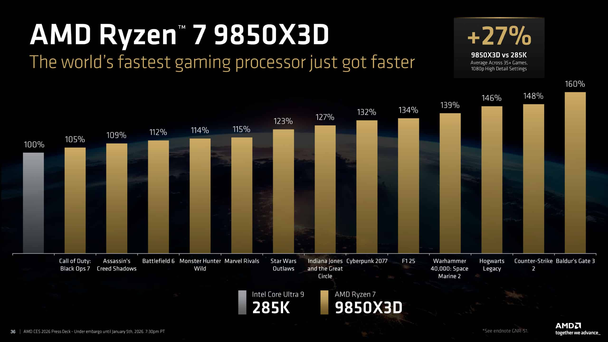 En términos de rendimiento, la compañía declara que este nuevo procesador es hasta un 27% más rápido que su rival de Intel. Es decir, el Intel Core Ultra 9 285K, uno de los máximos exponentes de la compañía azul. Cabe señalar que estas pruebas se realizaron en los juegos más populares del momento, como es el caso de Call of Duty Black Ops 7, Battlefield 6, Cyberpunk 2077, Star Wars Outlaws, entre otros.