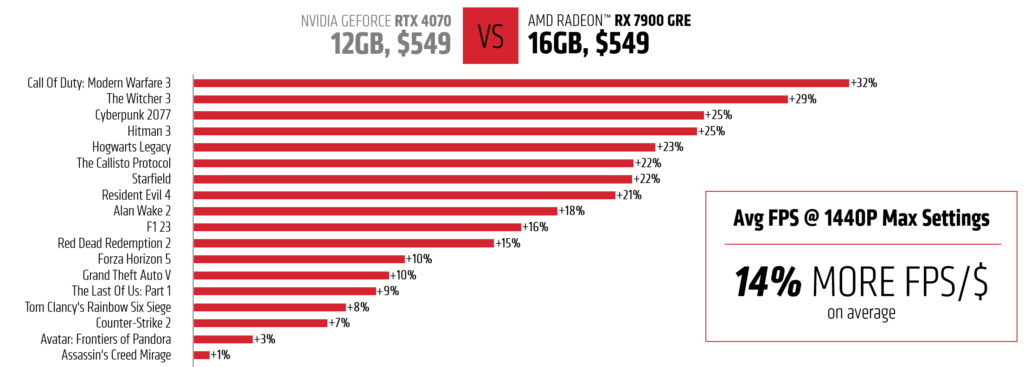 La tarjeta gráfica AMD Radeon RX 7900 GRE ofrece el rendimiento necesario para disfrutar de una experiencia de juego fluida y con alta tasa de refresco en los títulos más exigentes a 1440p.