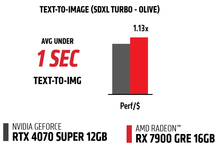 Al igual que todas las tarjetas gráficas AMD Radeon RX Serie 7000, la AMD Radeon RX 7900 GRE incorpora nuevos aceleradores de IA como parte de la unidad de cómputo unificada AMD RDNA 3. Los 160 aceleradores de IA que se encuentran en esta tarjeta gráfica se han optimizado para la inferencia FP16 y, cuando se combinan con la memoria GDDR6 de 16 GB en un bus de 256 bits, la AMD Radeon RX 7900 GRE ofrece un increíble rendimiento y valor de IA local. Permite generar imágenes con Stable Diffusion en menos de un segundo, o cargar modelos propios de lenguaje de gran tamaño aprovechando los 16 GB de memoria GDDR6 disponibles.
