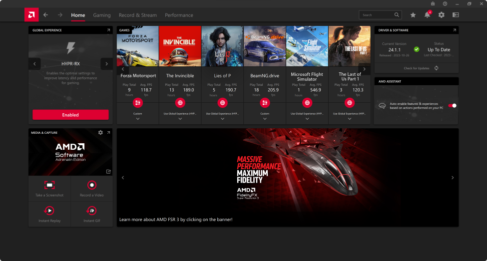 Cuenta con AMD FidelityFX Super Resolution 3, disponible en algunos de los títulos más populares de la actualidad, o también es posible activar la función integrada en el controlador, AMD HYPR-RX con tecnología AMD Fluid Motion Frames (AFMF), para conseguir el rendimiento necesario para sumergirte en el juego 4K a través de miles de títulos.