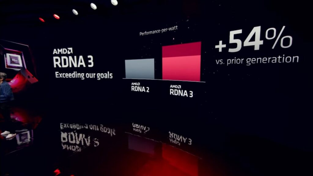 La arquitectura RDNA 3 combina los nodos de proceso de 5 nm y 6 nm. Cada uno está optimizado para trabajos específicos. Su tecnología ofrece hasta un 18 % más de frecuencia con una eficiencia energética 54% superior por vatio que la arquitectura AMD RDNA 2.