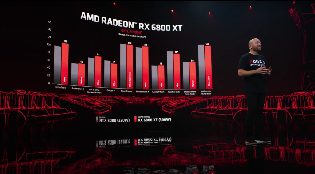 Con 72 unidades de cómputo, frecuencia base de 2015MHz. y boost de 2250MHz., Infinity Cache de 128MB y 16GB de VRAM, estamos frente a un equipo bastante potente en especificaciones. Todo esto con un consumo total de 300W. En rendimiento, sería comparable a una Nvidia GeForce RTX 3080 en juegos en 4K superando en algunos casos a su contraparte verde. Todo esto consumiendo 20W menos.