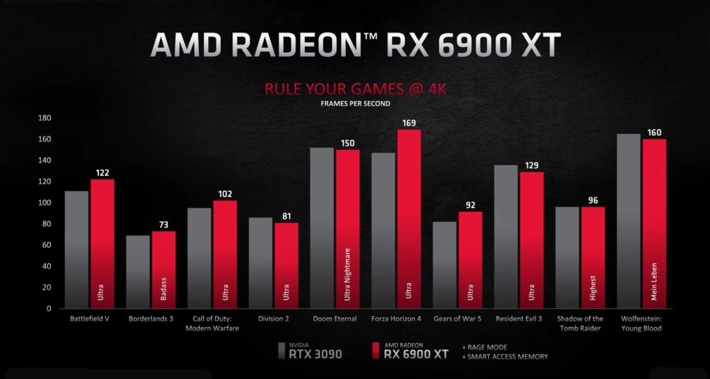 El plato fuerte de AMD es la nueva Radeon RX 6900 XT. Comparable con la GeForce RTX 3090, la gama más alta de la nueva línea nos ofrece los mismo 2015MHz. de frecuencia, 2250MHz. de boost, Infinity Cache de 128MB y 16GB de VRAM que la RX 6800 XT pero logrando mejores resultados.
