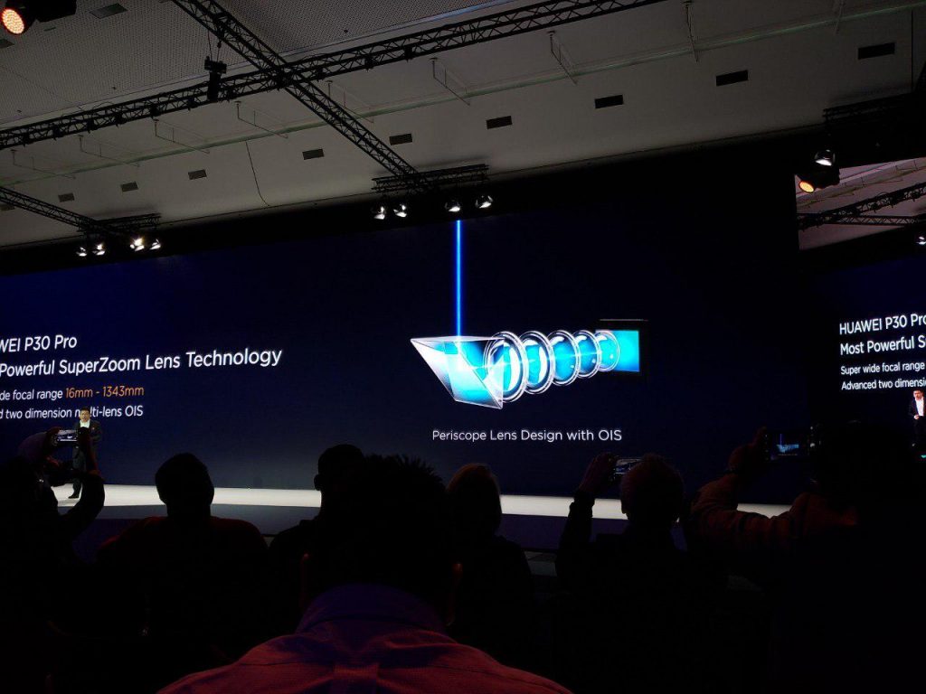 Se trata de un sensor de 8 megapíxeles, con apertura f/3.4 y OIS, el cual está posicionado de manera paralela al dispositivo — es decir, está de costado para que todo el sistema de la óptica pueda caber sin tener que aumentar el grosor general del equipo. Por ello se Huawei lo llama “teleobjetivo tipo periscopio”, pues funciona de manera similar a este tipo de instrumento óptico.