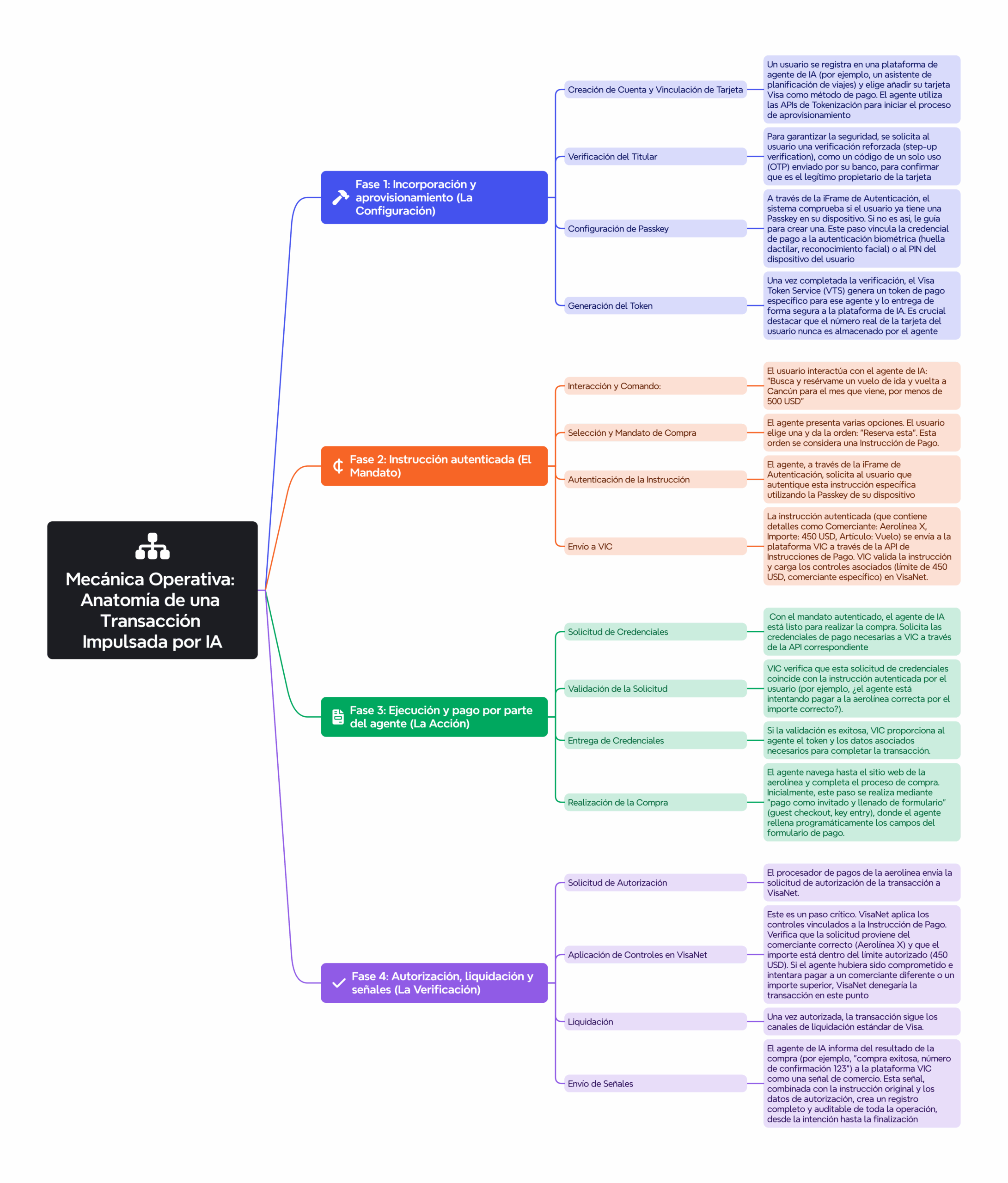 Fase 4: Autorización y Señales (Verificación): El comercio solicita la autorización a VisaNet, que aplica los controles definidos en la instrucción. Si todo coincide, la transacción se aprueba y se liquida. Finalmente, VIC emite una señal que vincula la compra con el mandato inicial, generando un registro trazable para auditoría y análisis de fraude.