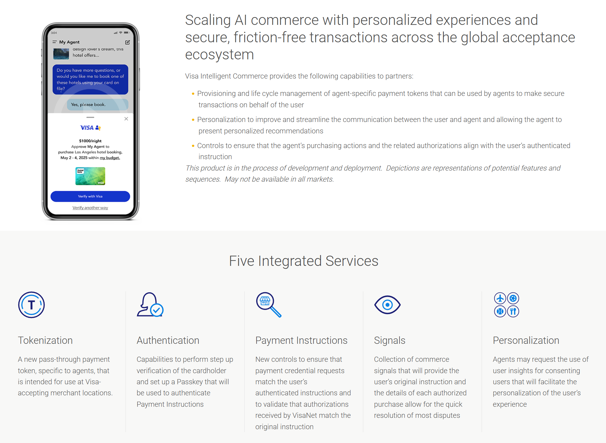 - Tokenización (AI-Ready Cards): cada agente de IA recibe una credencial tokenizada única generada por el Visa Token Service. Los tokens son programables y su riesgo se compartimenta según el tipo de agente o aplicación, de modo que los datos reales del usuario nunca se exponen.