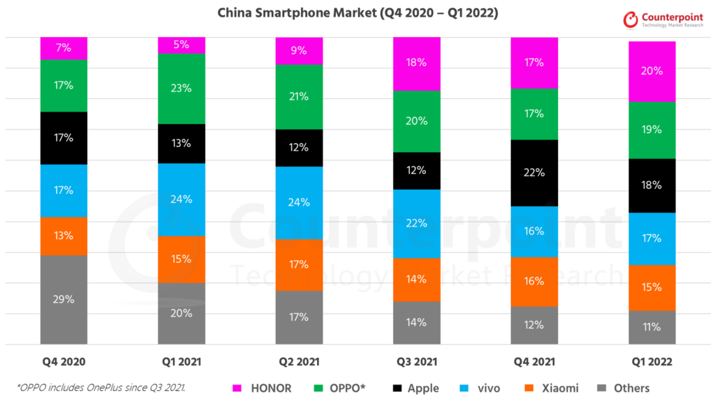 De acuerdo con Counterpoint, la venta de smartphones en China durante Q1 de 2022 es liderada por Honor con un 20% del mercado, superando, incluso a la manzana, en dos puntos porcentuales:
