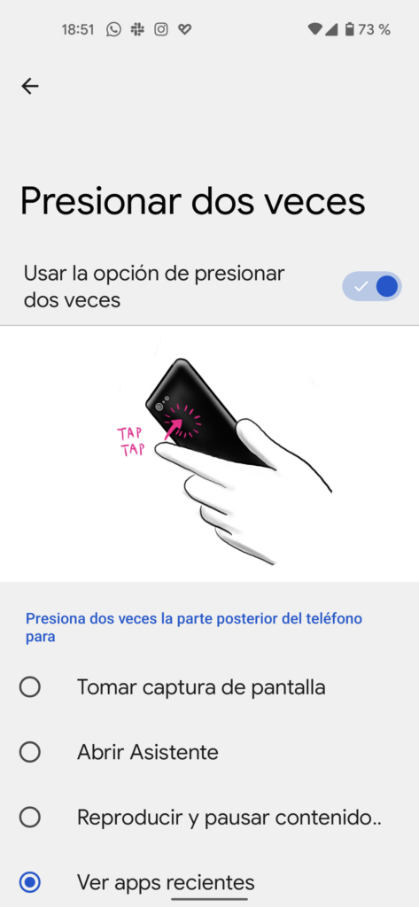 También se ha habilitado la función que permite tocar dos veces la parte posterior del teléfono para ejecutar alguna acción, y aunque de momento no funciona, si que nos permite seleccionar cuáles acciones se podrán ejecutar, ya sea tomar una captura de pantalla, abrir el asistente, ver las aplicaciones recientes o ejecutar alguna app en específico.
