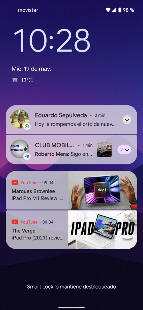Nada más iniciar Android 12 te darás cuenta de los cambios realizados en su pantalla de bloqueo, han movido la información del clima y fecha a la parte superior izquierda, mientras que el reloj ahora es enorme y se mueve entre la parte central y la superior dependiendo si tenemos notificaciones.