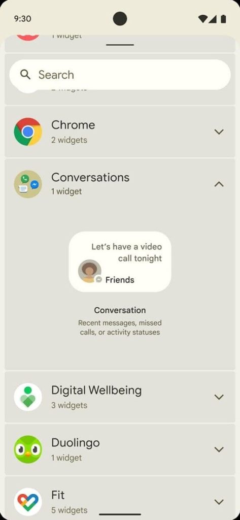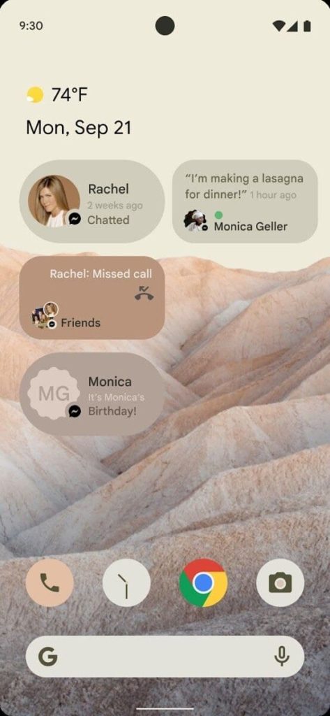 Respecto a los Widgets, las maquetas muestran uno nuevo llamado «Conversaciones«, el cual sería capaz de mostrar las últimas notificaciones y llamadas, tal y como se muestra en la barra de notificaciones actualmente, mostrando además la foto de perfil del contacto que haya enviado un mensaje.