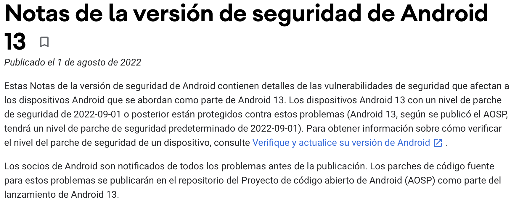 Pero, según lo que ha publicado Google en la web oficial de Android Open Source Project, nos da indicios de que podría presentarse finalmente en el mes de septiembre, ya que, ayer publicaron las notas de la versión de seguridad de Android 13, y ahí se especifica claramente que Android 13 traerá el parche correspondiente al 2022-09-01.