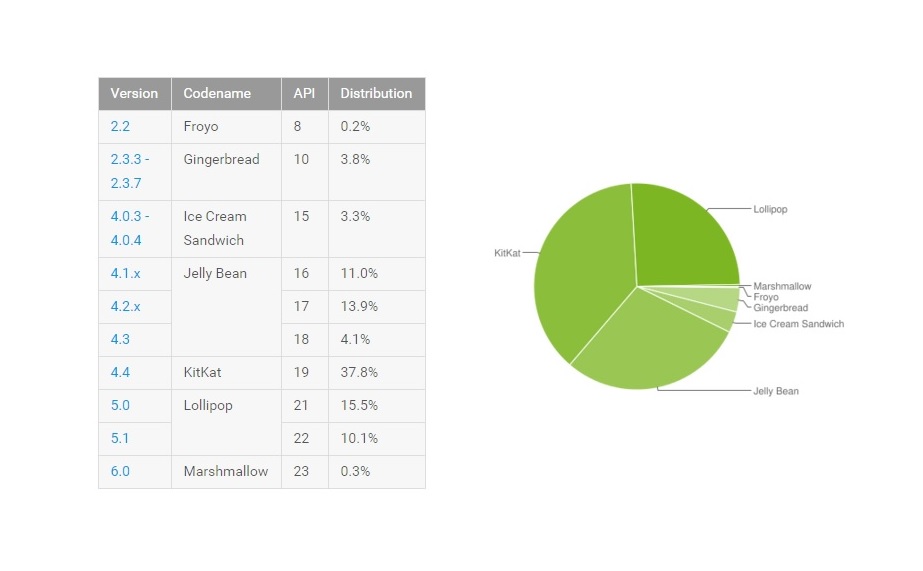 Si analizamos los datos, la segmentación de Android crece un poco más, limitándose a tres versiones que se llevan la mayoría del gráfico de torta – Sin pensar en el crecimiento de Marshmallow -. De hecho, si comparamos la imagen que acabamos de ver con la que mostraré a continuación sobre un reporte anterior, podrán notar que predominaban sólo dos versiones, alborotando un poco el panorama en el desastre de la fragmentación.