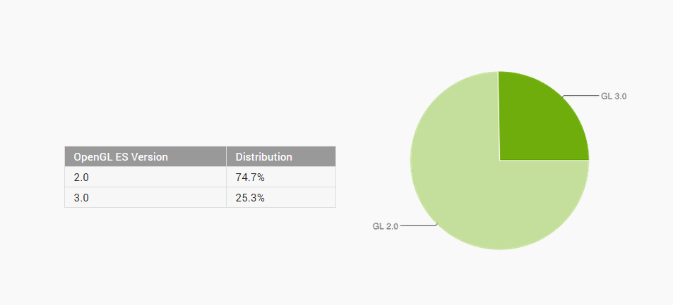 Otros datos indican que debido a las actualizaciones, ha aumentado el uso de dispositivos con tecnología Open GL 3.0 con un 25.3 %, esto es bastante bueno ya que crece la cantidad de dispositivos con la última tecnología para una mejor calidad gráfica en el uso de las aplicaciones e interfaz. Sin embargo Open GL 2.0 lidera en las distintas plataformas con un 74.7%.