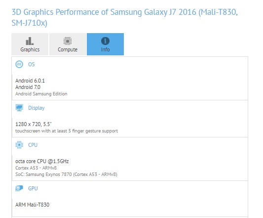 La información viene de GFXBench, donde ha aparecido un Galaxy J7 (2016) corriendo Android Nougat en su versión 7.0, lo cual coincide con las primeras especulaciones, las cuales indicaban que el smartphone iba a recibir la actualización para el mes de julio de este año.