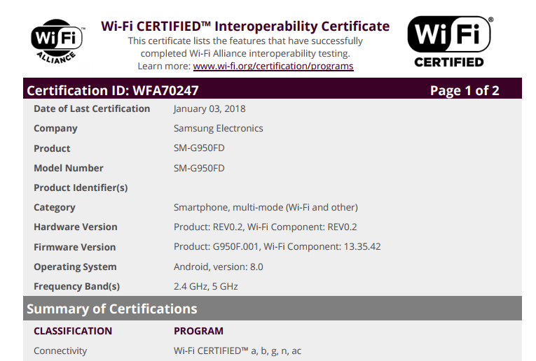 Las variantes Global, Europea, Asiática y Coreana de los Galaxy S8 recientemente han sido vistas en el sitio de la Wi-Fi Alliance, lo que significa que Android Oreo para estos dispositivos ya cuentan con su certificación Wi-Fi. Esta es la lista de todos los modelos que fueron certificados: