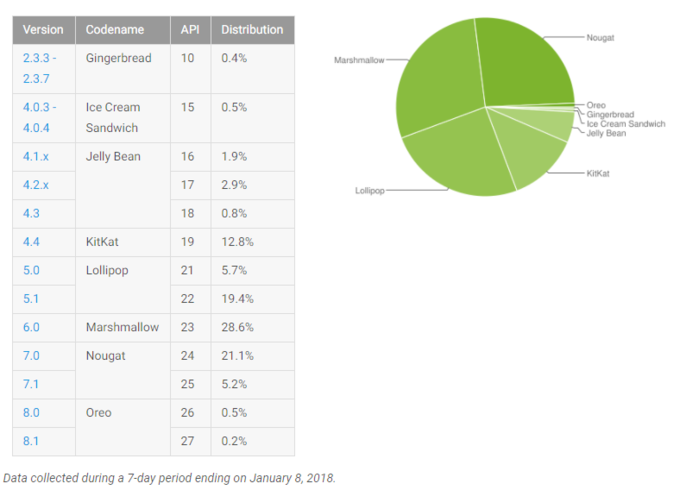 La versión más popular de Android sigue siendo Marshmallow, que llega ya al 28.6%, mientras que Nougat se encuentra en el segundo lugar con un 26.3%. Al borde del abismo, en tanto, encontramos a Gingerbread con un 0.4% y Ice Cream Sandwich con un 0.5%. De este modo, largo trecho le queda a Google para solucionar los problemas de fragmentación de Android, mientras los fabricantes tratan de actualizar lo antes posible sus dispositivos.