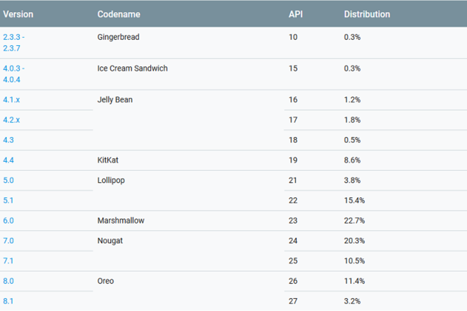 Android Nougat siegue siendo la versión con más adopción rondando el 31%, mientras que Marshmallow (22.7%) e incluso Lollipop (19.2%) se encuentran instalados en más dispositivos que Android Oreo, lo que no es sorpresa, pero que no es una buena noticia.