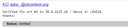 Según el problema reportado en Chromium, se estaría usando una build LRW52G en un Nexus 4. La versión más reciente identificada en un Nexus 5 es la LRW66E, que corresponde a una más nueva respecto a la expuesta previamente.