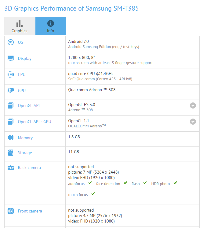 El modelo con nombre clave SM-T385 aparece corriendo Android Nougat en su versión 7.0 desde el inicio junto con un procesador Qualcomm Snapdragon 427, 2GB de memoria RAM y 16GB de almacenamiento interno, todo esto en una pantalla de 8 pulgadas con resolución de 1200×800.