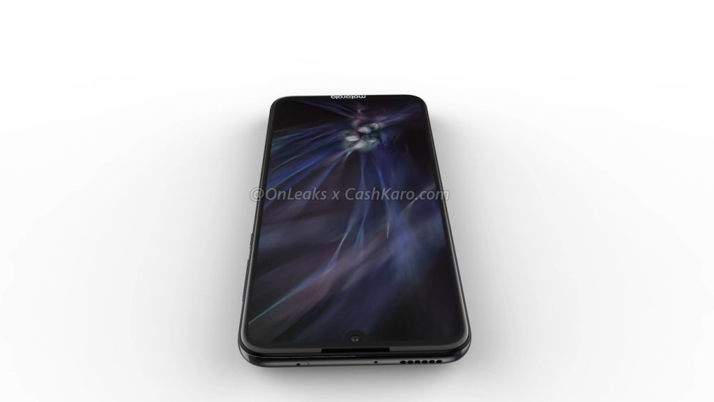 Pasamos a ver el lado frontal donde vemos su pantalla de 6,2 pulgadas con un notch en forma de gota de agua y en la parte inferior tenemos una barbilla donde vemos la marca «motorola». En ningún lado vemos un sensor de huellas dactilares, por lo que creemos que se encontrará debajo de la pantalla.