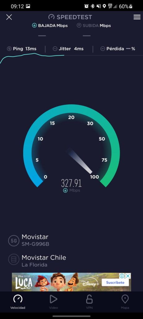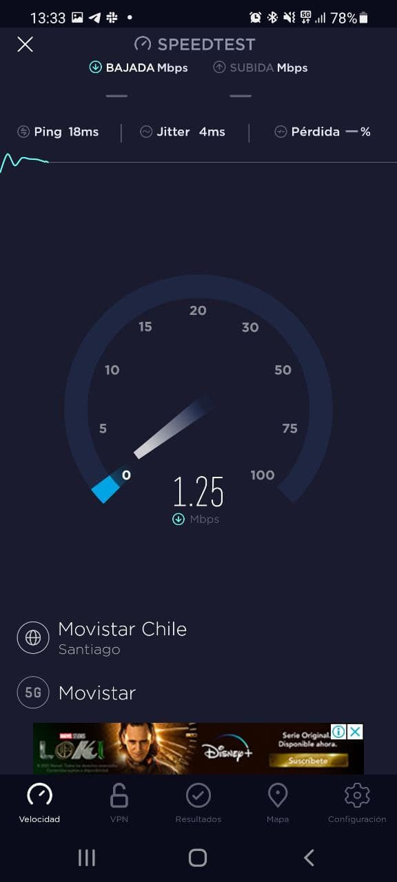También nos comentó que la velocidad no siempre anda arriba de los 100 Mbps, ya que hay ocasiones en que ni siquiera supera los 5 Mbps de descarga, teniendo la señal al máximo. Por ejemplo, esta prueba fue tomada en Los Leones, a la altura de Diego de Almagro, Providencia.