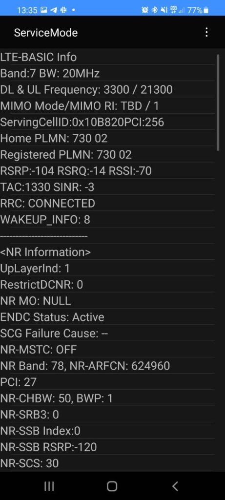 Gracias a aquellas capturas, podemos confirmar que Movistar está operando con una red 5G NSA en la banda N78 usando a la vez la red 4G en la banda B7, al igual como lo hace el operador Entel.
