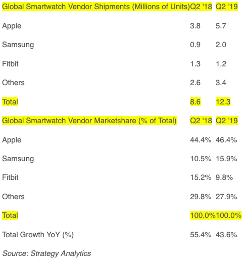 Los surcoreanos de Samsung han peleado bastante para alcanzar a Apple en este mercado, pero no ha sido suficiente, ya que solo enviaron 2.0 millones de relojes inteligentes en todo el mundo durante el segundo trimestre del 2019, mucho más de los 0.9 millones que vendieron en el 2018.