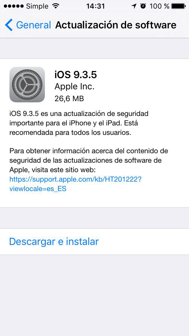 Ya estamos ad portas de la llegada de iOS 10, pero Apple sigue impulsando actualizaciones de seguridad para sus dispositivos actuales. En esta ocasión es la versión 9.3.5 la que comenzará a llegar a partir de hoy desde el iPhone 4S en adelante.