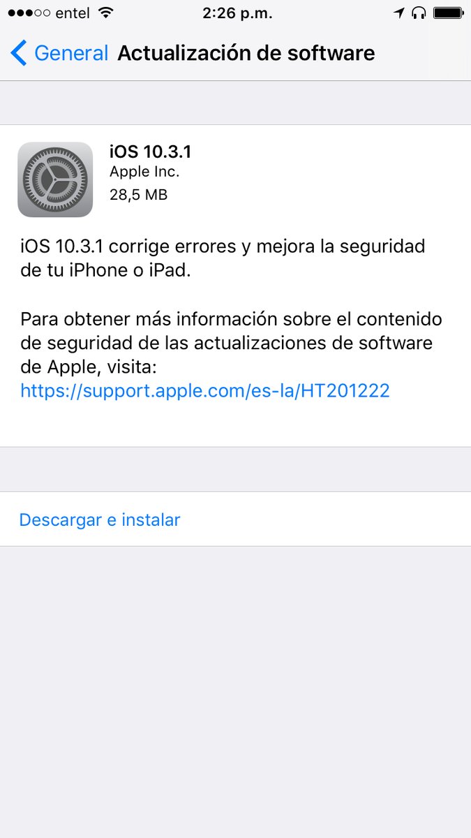 Se trata de iOS 10.3.1 que solo viene a arreglar algunos errores detectados en la versión publicada la semana pasada, ya que el aviso de actualización informa que solo viene a corregir errores y a mejorar la seguridad de tu iPhone y iPad.
