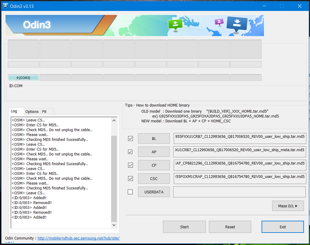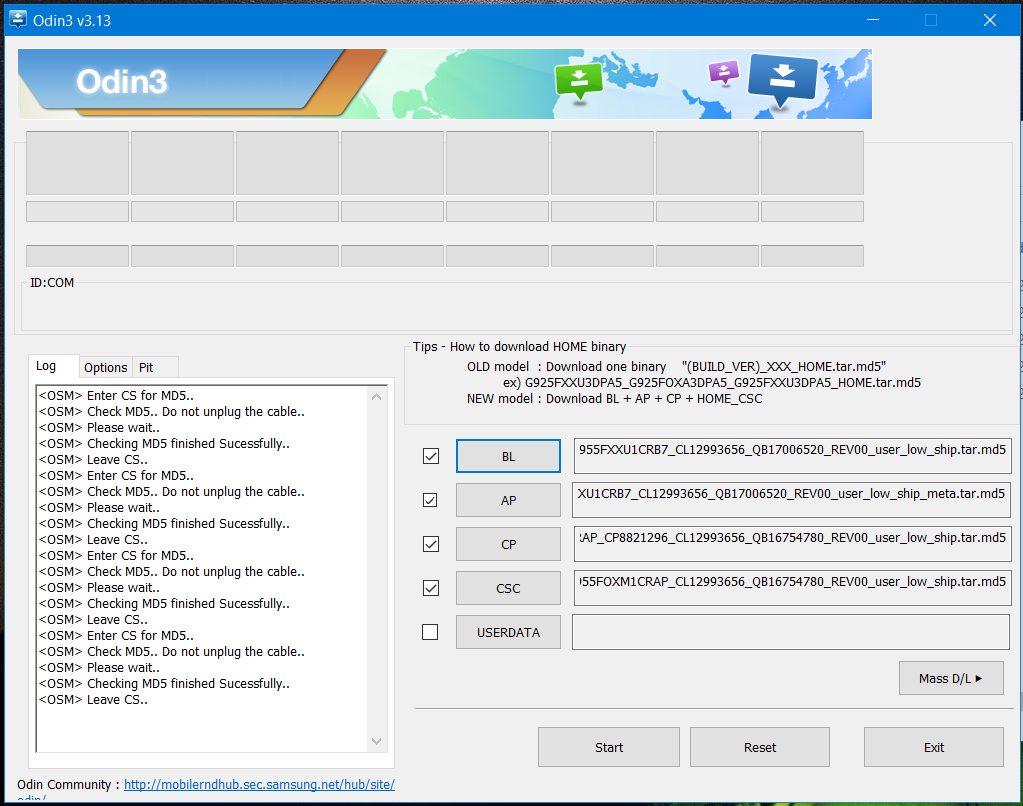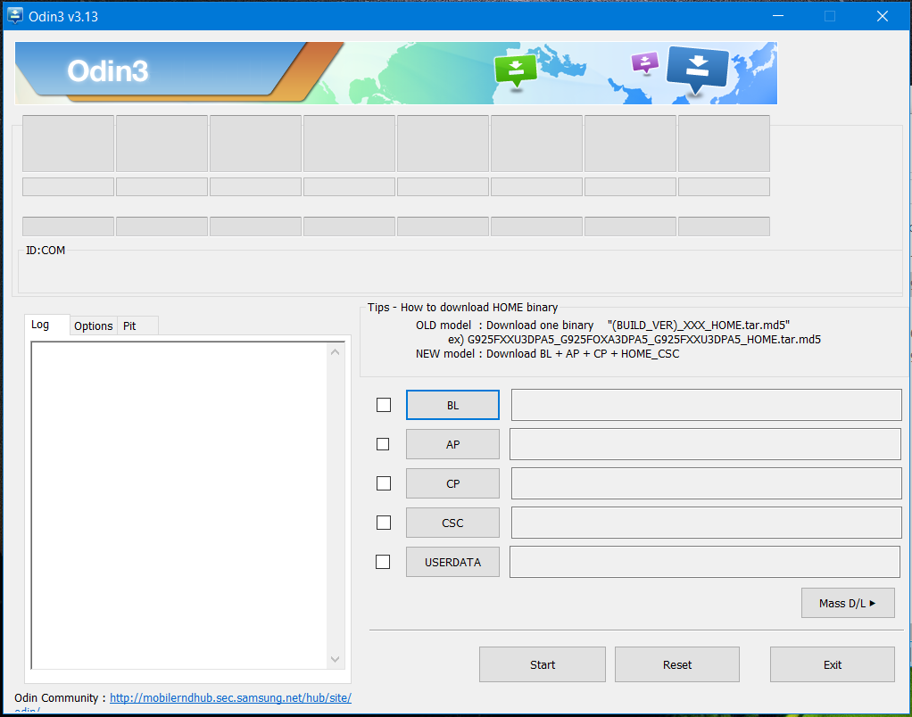Una vez que hayan conectado su S8 o S8+ en modo Download al computador, en Odin debería aparecer conectado su equipo en la parte superior izquierda, donde dice «ID:COM«.