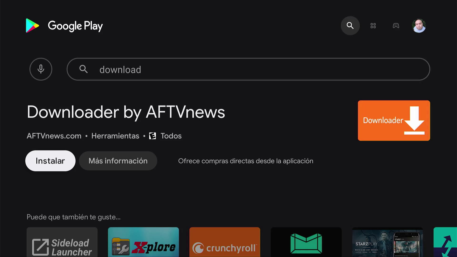 Primero, debemos ir a Google Play en nuestro Android TV, buscar y descargar la aplicación llamada “Downloader”, para luego instalarla en nuestro dispositivo y posteriormente abrirla.