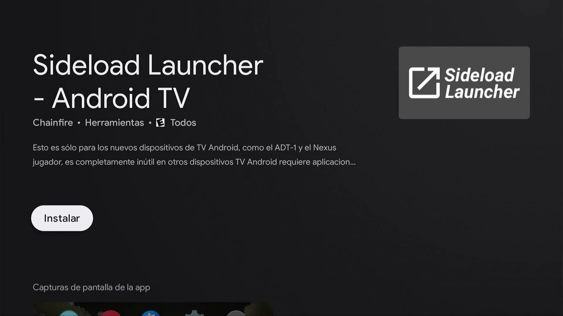 Ahora, debemos instalar una aplicación más que nos permitirá tener acceso a las aplicaciones que no fueron hechas para Android TV. Para eso, vamos a Google Play en nuestro dispositivo y buscamos la app “Sideload Launcher”, la descargamos e instalamos.