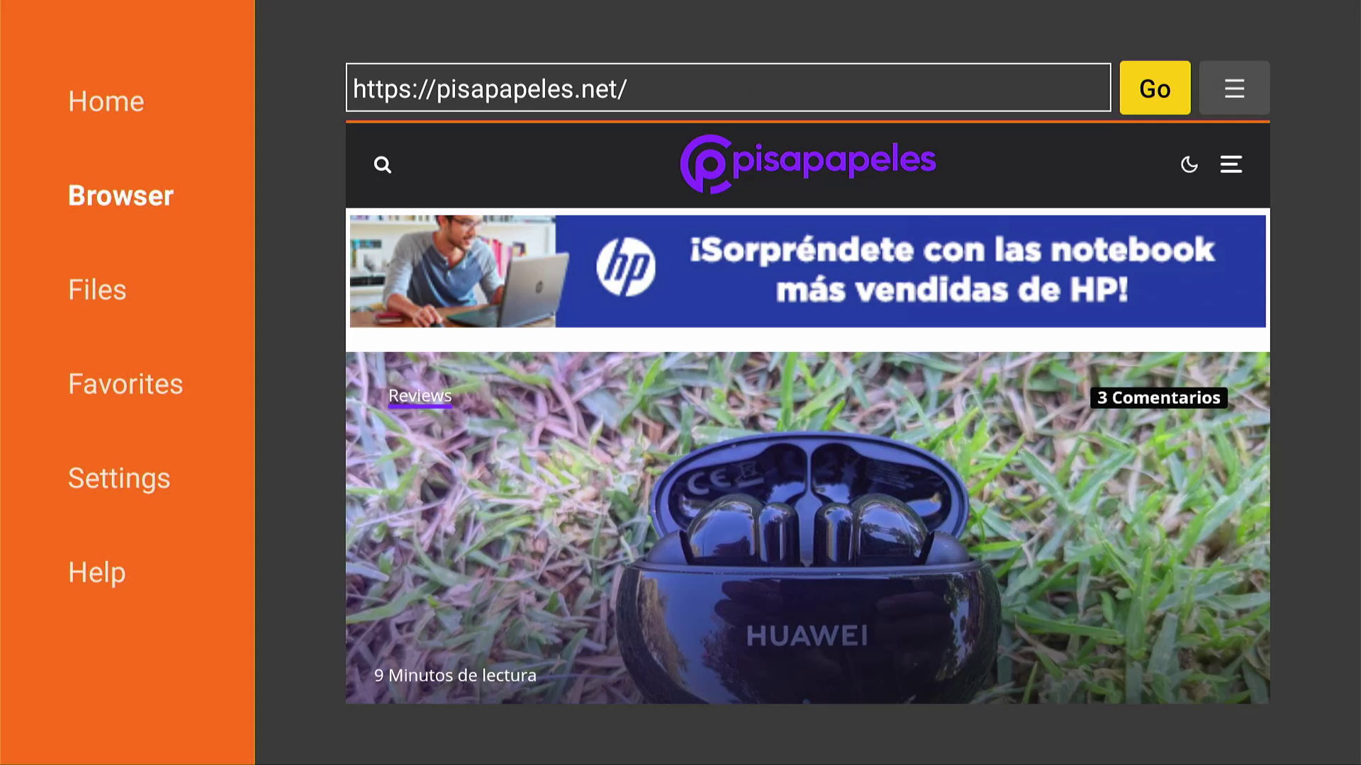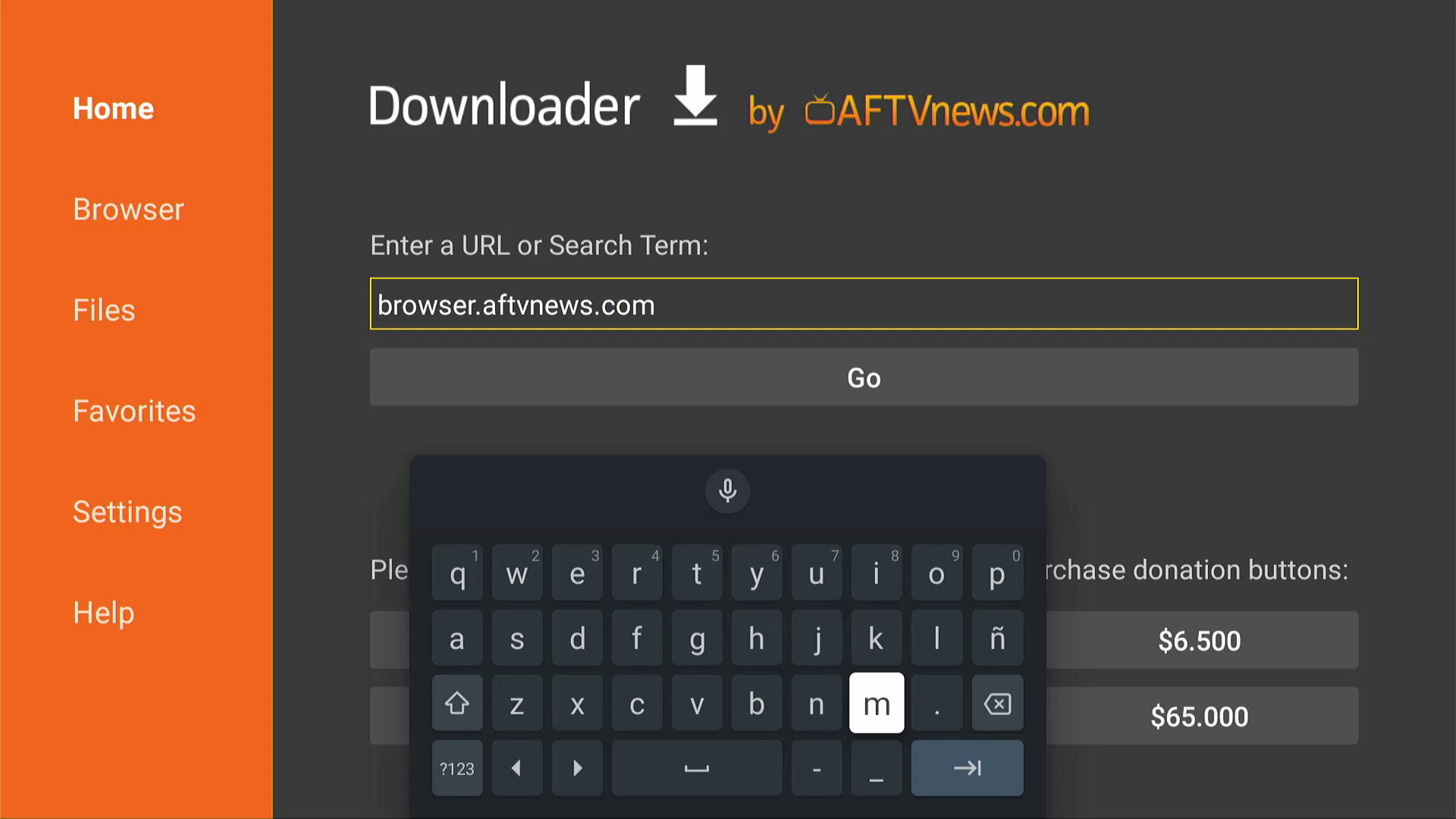 En la misma aplicación seleccionamos el apartado “Home” que está ubicado a la izquierda de la pantalla, hacemos click en donde dice “Enter a URL…”, y ahí debemos escribir lo siguiente: browser.aftvnews.com, y seleccionas “Go”.