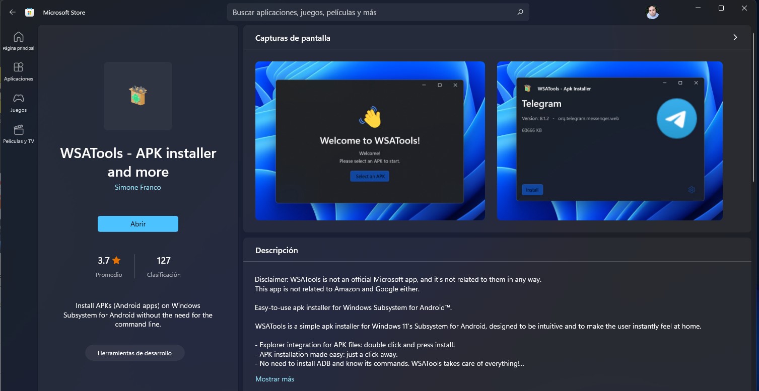 Pero, puedes instalar los archivos APK de manera manual y rápida. Sólo anda a la Tienda de Windows, y busca el programa «WSATools – APK installer and more», lo instalas, sigues las instrucciones en pantalla y podrás instalar fácilmente archivos APK.