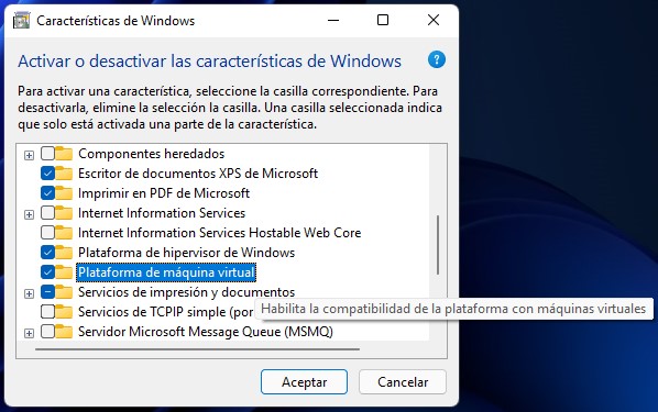 En la ventana nueva que se abrirá, debes buscar la opción llamada “Plataforma de máquina virtual”. Cuando la encuentres, debes marcarla y luego presionar el botón “Aceptar”.