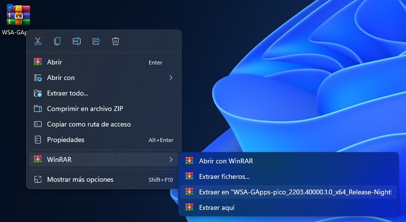 Una vez descargado el archivo, debes descomprimirlo en una carpeta nueva. Si usas WinRAR, debes elegir la opción que ves en la siguiente captura: